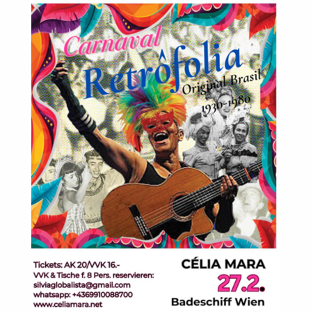 Freude, Lust & Laster regieren! Am 27 Februar eröffnet Célia Mara das bunte Treiben mit Retrôfolia. Da stehen die kleinen Carnevalsmärsche von 1930 bis 1970, die schönsten alten Sambas und mitreißende Olodums der 1980er Jahre am Programm.